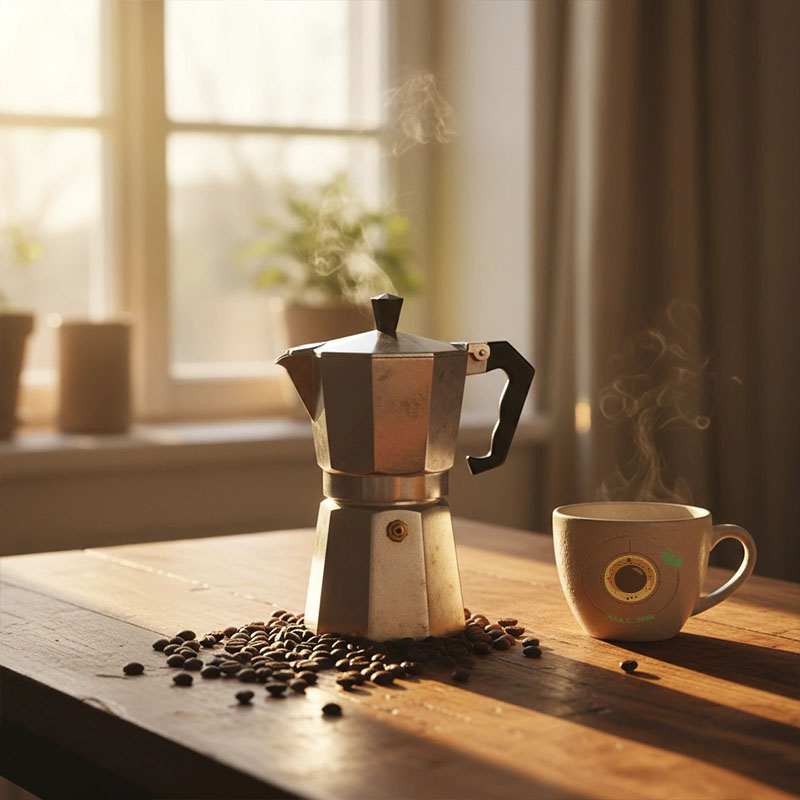 موکاپات یا قهوهساز کلاسیک ایتالیایی، ابزاری است که قهوهای نزدیک به اسپرسو اما با فشار کمتر تولید میکند. بخار آب از مخزن پایین بالا آمده و از میان پودر قهوه عبور میکند تا نوشیدنیای غلیظ، معطر و سنتی به دست دهد.